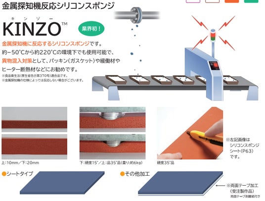 金属探知機反応シリコンスポンジ「KINZO」金属探知機に反応するシリコンスポンジです。約-50℃から約220℃の環境下でも使用可能で、異物混入対策として、パッキン(ガスケット)や緩衝材、ヒーター断熱材などにお勧めです。食品製造工場での異物混入対策に導入されています。シートタイプのシリコンスポンジで、柔軟性に富み、カッターやハサミで簡単にカットできます。