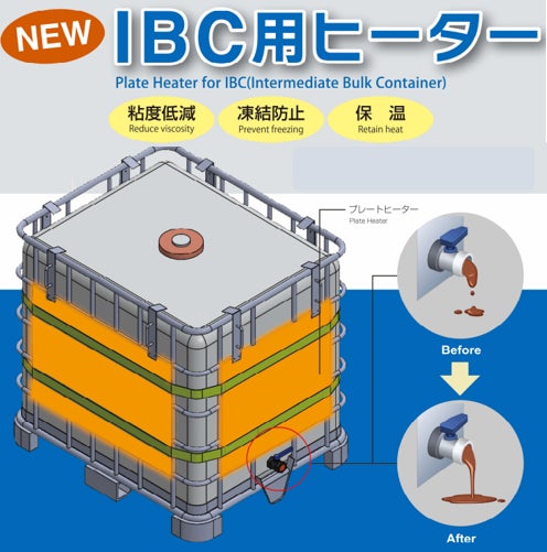 【新製品】IBC用ヒータータンク外側四面にヒーターを取り付けることで、タンク内の液体の粘度を効果的に低減や凍結防止、保温をします。4面パネル組み立て式のため、一人でも簡単に取り付けできることができます。