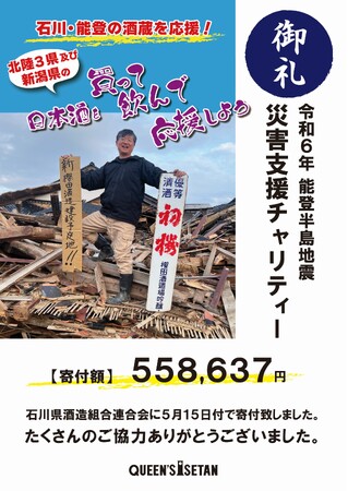 株式会社三越伊勢丹ホールディングスのグループ会社であり、首都圏を中心に19店舗のスーパーマーケット(クイーンズ伊勢丹)を運営する、株式会社エムアイフードスタイル(本社:東京都新宿区、代表取締役社長:雨宮 隆一)は、食品スーパーマーケットとして、2024年1月1日に発生した「令和6年能登半島地震」において被災された地域の商品(今回は日本酒)の販売を通じ、応援につなげていきたいという思いから災害支援チャリティーを実施し2024年5月15日(水)、石川酒造組合連合会に寄付を行いましたことをご報告いたします。たくさんのご協力ありがとうございました。