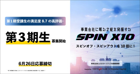 事業を創造し世界を変えるスタートアップに出資する株式会社ゼロワンブースターキャピタル(本社:東京都千代田区、代表取締役 鈴木規文、以下「01Booster Capital」)は、多様な主体によるスタートアップ支援展開事業(主催:東京都/TOKYO SUTEAM)の事業として、スピンオフ・スピンアウトに取り組む事業会社を10倍にすることを目指し、インキュベーションプログラム「SPIN X10(スピンエックス)」を展開しています。2024年4月からプログラム開催中の第2期では、自動車会社様・輸送用機器会社様・電力会社様・消費財化学会社様・製薬会社様・航空会社様・アニメ制作会社・保険会社様・食品会社様・電子機器会社様・学校法人など19社から23名を採択。第1期・第2期を合計して、41名の次世代リーダーたちが受講し、VCやCVCを含めた月次懇親会(招待制)に参加。第1期受講生の満足度は、10点中8.7の高評価をいただきました。このたび、2024年7月から9月に開催予定の第3期の参加者15名程度を募集いたします(応募締切は2024年6月26日)。事業会社でこれからスピンオフ・スピンアウトに取り組みたい方、既に実行している方、ぜひご参加ください。WEBサイト:https://spinx10.01booster.co.jp