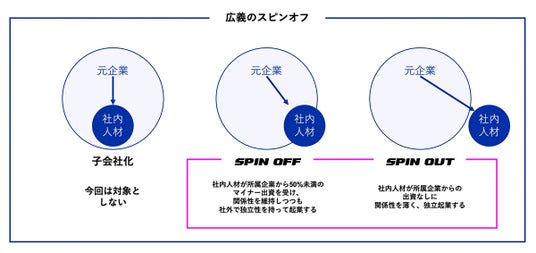 なお、第1~3期の開催後、続いて第4期(2024年10月~12月)を開催予定です。 スピンオフ・スピンアウトとは: 本プログラムでは、スピンオフ(SPINOFF)は社内人材が所属企業から50%未満のマイナー出資を受け起業、スピンアウト(SPINOUT)は社内人材が所属企業からの出資なしに独立起業していることとしております。