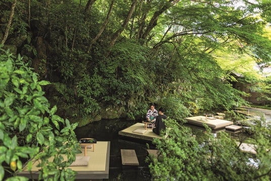 平安貴族が興じた嵐山にたたずむ水辺の私邸で時を忘れる。渡月橋から船に乗り、大堰川を遡った先では、京都に息づく日本の伝統技法を感じる客室、嵐山の情景を映した滋味豊かな日本料理、四季の美しい景観と静けさの非日常が提供されます。