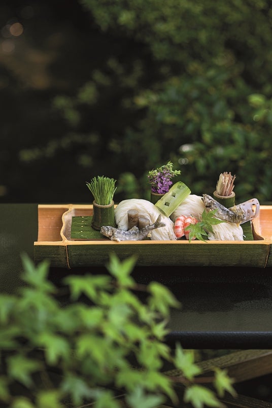 平安時代の七夕行事の儀式には、小麦粉製の唐菓子、索餅(むぎなわ・さくべい)が供え物として用意されていました。(*3)その索餅がのちに七夕に素麺を食べる習慣に繋がったと言われています。(*4)梶の葉に願いをしたためた後は、総料理長特製の素麺を味わいます。涼し気な青竹の器には、素麺と共に川の中を泳ぐような鮎のから揚げを用意しました。