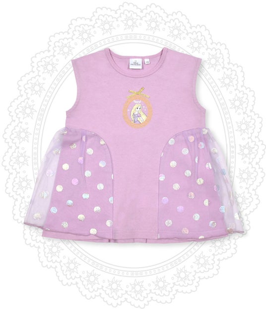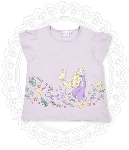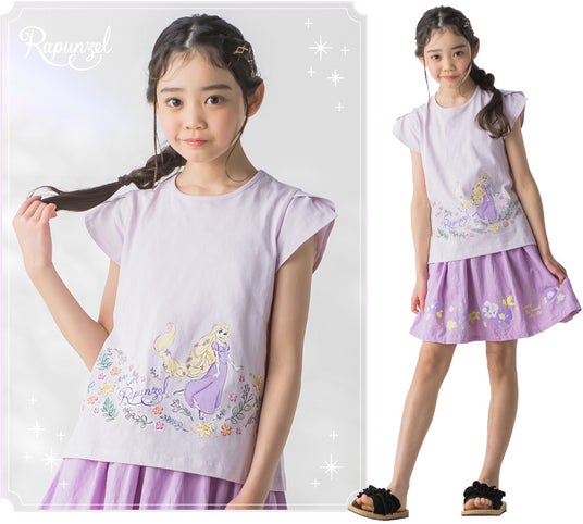 トレードマークのロングヘアをお花で飾った「ラプンツェル」とたくさんのお花のプリントが華やか。ちりばめられたパールビジューが上品なポイントです。「ラプンツェル」のドレスとお揃いのむらさき色♪