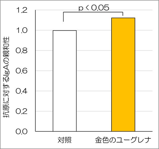 これまでの研究成果で、金色のユーグレナ(パラミロンEOD-1)は、自然免疫(*7)に働く単球(*8)と獲得免疫(*9)に働くナイーブT細胞(*10)の働きをサポートすることで、生体防御機能を高めることを報告しました(*11)。今回のIgAの親和性を高める作用は、これらの機能が高まった結果である可能性が考えられます。