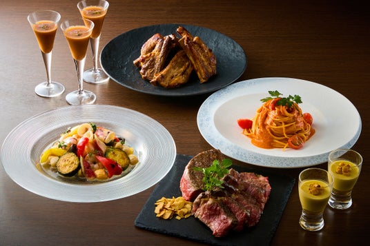今回のフェアでは、グルメの宝庫、韓国で定番の伝統料理や創作料理の数々がラジョウビュッフェに登場。韓国料理には欠かせない「プルコギ」、春雨を使った伝統的な家庭料理「チャプチェ」をはじめ、韓国風のり巻き「キンパ」やピリッとした辛みと具材の旨味がやみつきになる「チゲ風スープ」はもちろん、鉄板の韓国グルメ「韓国焼肉(※ディナー限定)」は牛&豚の2種類でご用意します。さらに、食感がたまらない「韓国風フライドチキン」や螺旋状に切ったじゃがいもを串に刺して揚げた屋台グルメ「トルネードポテト」、マカロンの進化系スイーツ「トゥンカロン」もラインアップ。また、韓国グルメ以外にも、夏の訪れを感じる「鱧のフリット」や「夏野菜と無花果のシーフードマリネ」、「とうもろこしのブランマンジェ」など、ラジョウシェフの新作メニューもテーブルを彩ります。