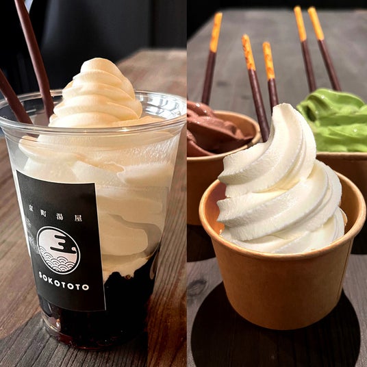 左:コーヒーゼリーソフトクリーム添え¥680 (税込)右:京町ソフトクリーム(抹茶・チョコ・バニラ)各¥450 (税込)<京町湯屋SOKOTOTO飲食メニュー紹介>