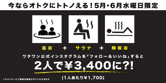 株式会社antiqua(本社:大阪府和泉市)は大阪・岸和田のWHATAWONに5月1日(水)オープンした「京町湯屋SOKOTOTO」にて、5月22日(水)より期間限定キャンペーンを開始することをお知らせいたします。「今ならお得にトトノえる。」温浴・サウナ・陶板浴の利用が対象となる本キャンペーンは毎週水曜日に開催。最大半額で施設の利用ができるペア割りを実施します。