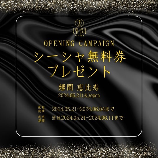 東京、恵比寿 - 2024年5月21日(火)大人気の「シーシャ 煙間 -エンマ」が、ついに恵比寿に新店舗をオープンします。銀座店、新宿歌舞伎町店、新宿西口店、渋谷店に続き、5店舗目となる恵比寿店は、カラオケ個室も完備し、ワンランク上のエンタメ体験を提供します。