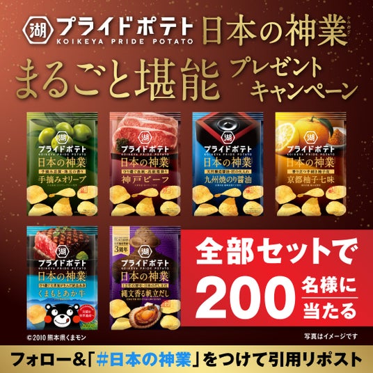 第一弾キャンペーンとして、5月発売の「湖池屋プライドポテト 日本の神業 手摘みオリーブ」、「湖池屋プライドポテト 日本の神業 神戸ビーフ」、6月発売の「湖池屋プライドポテト 日本の神業 九州焼のり醤油」、「湖池屋プライドポテト 日本の神業 京都柚子七味」、7月発売の「湖池屋プライドポテト 日本の神業 くまもとあか牛」、「湖池屋プライドポテト 日本の神業 縄文香る帆立だし」の6商品のセットが抽選で200名様に当たる「日本の神業 まるごと堪能プレゼントキャンペーン」を2024年5月20日(月)より実施します。