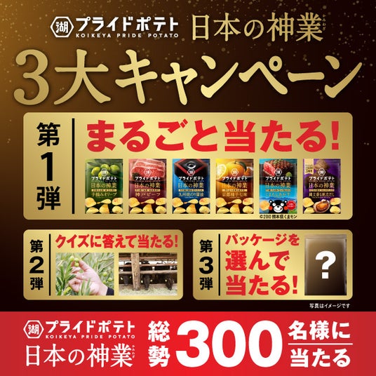 株式会社湖池屋(社長:佐藤章)は、世界から注目を集める“日本産食材の魅力”を支える匠の技と情熱の結晶である“日本の神業”を中核とした「湖池屋プライドポテト 日本の神業」シリーズの展開開始を記念し、全国各地の“日本の神業”をお伝えすることで、日本全国に元気をお届けしたいとの想いから、“日本の神業 3大キャンペーン”を実施します。