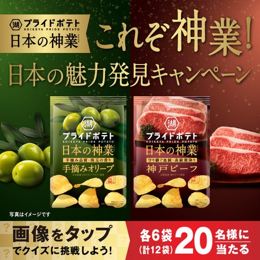 同じく5月20日(月)より、第二弾キャンペーンとして、全国各地の“日本の神業”に関するクイズに答えてご応募いただくと、期間ごとに異なる「湖池屋プライドポテト 日本の神業」シリーズの商品が抽選で各20名様(計60名様)に当たる「これぞ神業!日本の魅力発見キャンペーン」を実施します。
