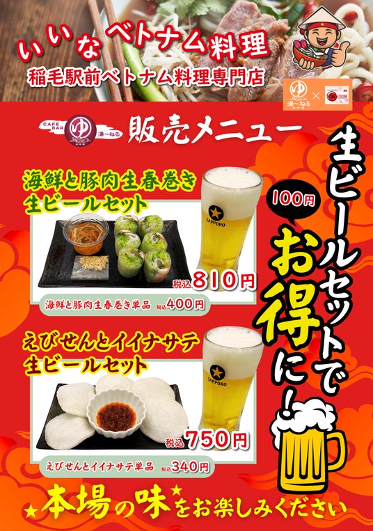 天然温泉 湯~ねる(千葉県習志野市、代表:金光淳用)にて5月22日(水)より千葉市稲毛区にある人気ベトナム料理店「いいなベトナム料理」が出張販売を行います。この特別な機会に、ぜひ本場の味をお楽しみください。