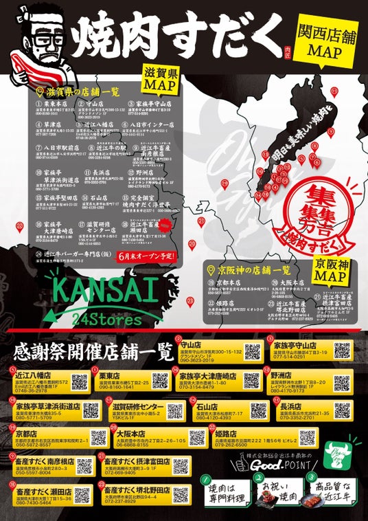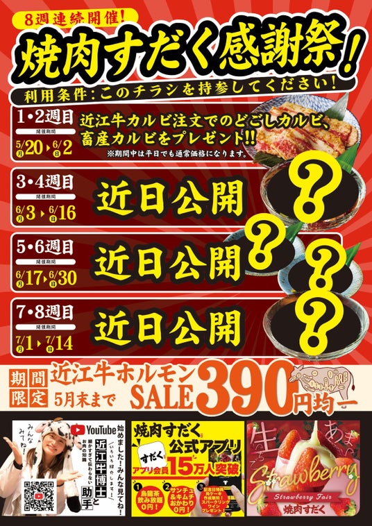 株式会社総合近江牛商社(本社:滋賀県守山市/代表取締役社長:西野 立寛)が運営する【近江焼肉ホルモンすだく】は、2024年5月20日(月)~7月14日(日)の8週にわたり、下記の対象店舗にて「焼肉すだく感謝祭」を開催いたします。