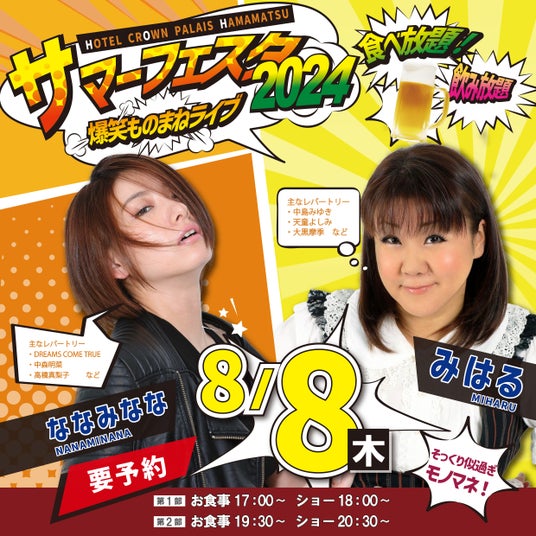 ホテルマネージメントインターナショナル株式会社(略称:HMIホテルグループ、本社:東京都中央区日本橋)が運営する、ホテルクラウンパレス浜松(静岡県浜松市)では、サマーフェスタ2024~爆笑ものまねライブ~を開催いたします。