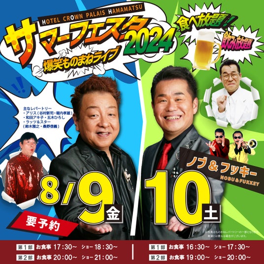 サマーフェスタ2024 ~爆笑ものまねライブ~は、ものまねライブを楽しみながら、鉄板焼ステーキ・お寿司など約20種類の料理を提供するホテルバイキングと生ビール・ジュースなどの飲み放題付のディナーショー。