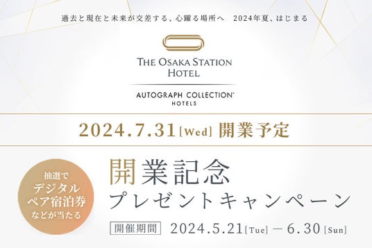 株式会社ジェイアール西日本ホテル開発(京都府京都市下京区、代表取締役社長 伊勢 正文)は、運営するJR西日本ホテルズの「THE OSAKA STATION HOTEL, Autograph Collection」(「大阪ステーションホテル、オートグラフコレクション」以下「大阪ステーションホテル」)が2024年7月31日(水)(※予定)に開業することを記念し、期間中にグループホテルをご利用いただいたお客様を対象としたプレゼントキャンペーンを、5月21日(火)より開始いたします。