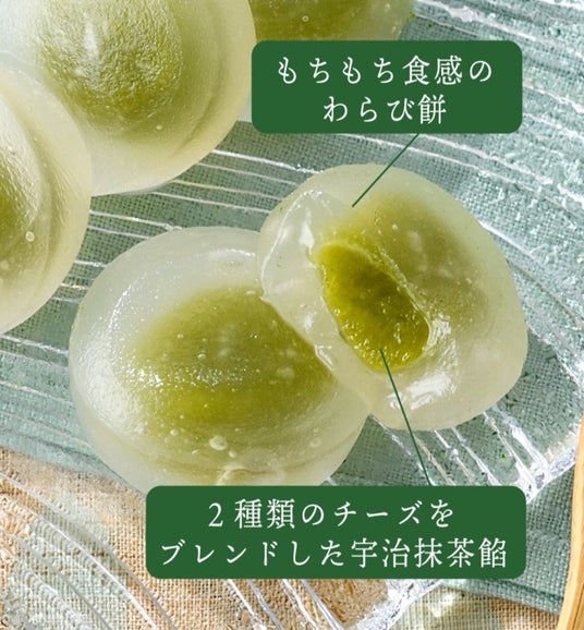 【夏季限定】もちもち食感!2種のチーズと宇治抹茶餡のわらび餅マスカルポーネチーズとカマンベールチーズをブレンドした抹茶餡を甘みのあるもちもち食感のわらび餅で包み込みました。宇治抹茶とチーズの絶妙なコンビネーション。和洋の美味しさをお楽しみください。