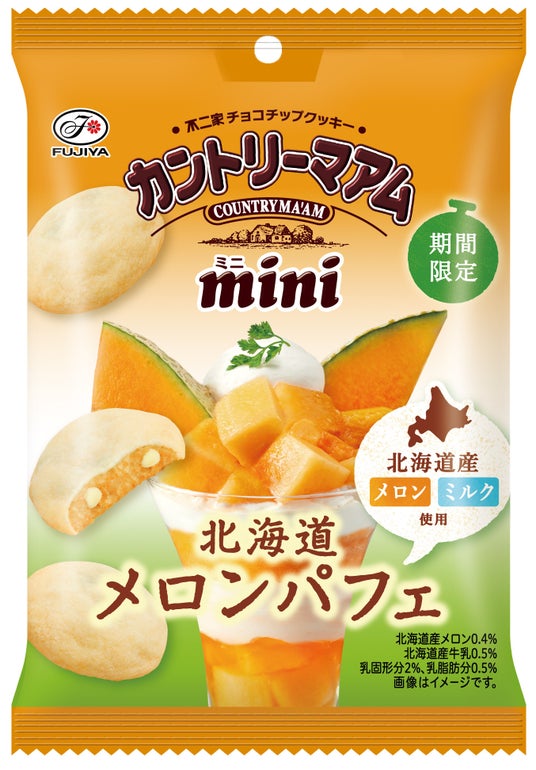 ・北海道産赤肉メロンのピューレと北海道産ミルクを練り込んだしっとりとした生地に、ホワイトチョコチップを組み合わせ、メロンパフェをイメージしたカントリーマアム