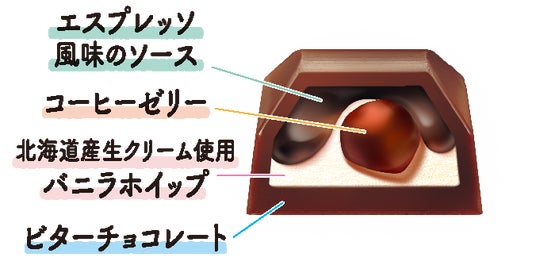 ・北海道産生クリームを使用したバニラホイップ、コーヒーゼリー、エスプレッソ風味のソースが入った大粒ビターチョコレート