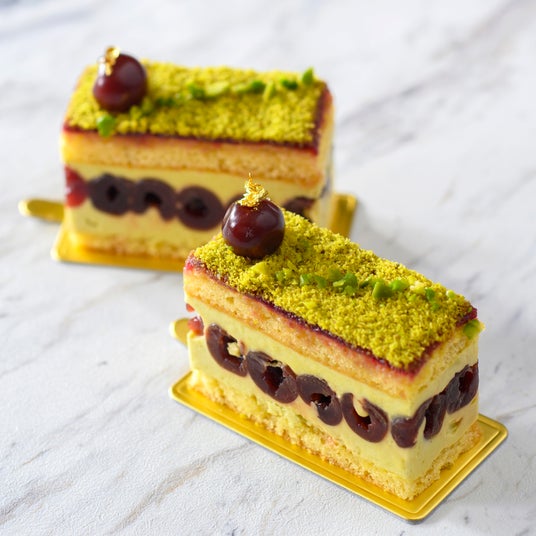アメリカンチェリーをピスタチオのムースリーヌと生地でサンドしました。