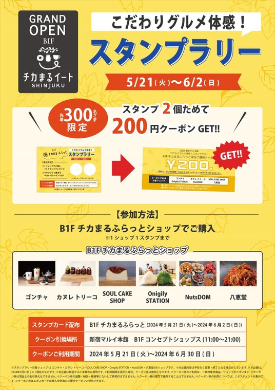 開催期間中に「チカまるふらっと」の1ショップでお買物いただくとスタンプ1個押印します。2ショップでお買物いただきスタンプを2個ためると、「チカまるふらっと」でご利用可能な 200円クーポン券を先着300名さまにプレゼント! ぜひこの機会に「チカまるふらっと」のこだわりのグルメを体験ください。