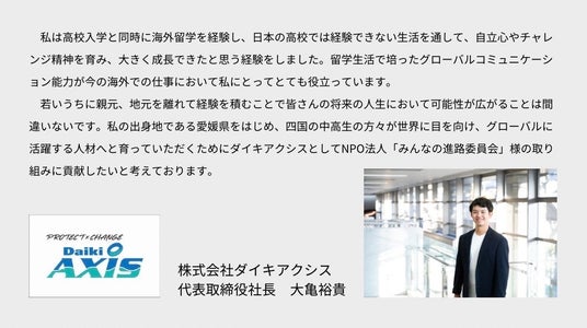 若いうちに親元、地元を離れて経験を積むことで皆さんの将来の人生において可能性が広がることは間違いないです。私の出身地である愛媛県をはじめ、四国の中高生の方々が世界に目を向け、グローバルに活躍する人材へと育っていただくためにダイキアクシスとしてNPO法人「みんなの進路委員会」様の取り組みに貢献したいと考えております。