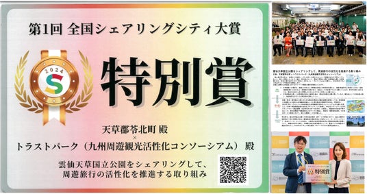 熊本県天草郡苓北町(苓北町長:山崎 秀典)と九州周遊観光活性化コンソーシアム(代表機関:トラストパーク株式会社 本社:福岡県福岡市博多区、代表取締役:山川 修)は、多様化する旅客ニーズに対応した宿が少ないという課題を抱える天草エリアにおいて、新たな滞在スタイルや、観光・防災拠点として、雲仙天草国立公園「富岡海域公園」の駐車場に安心・安全に車中泊ができる「車泊(くるまはく)」・ RVパークsmart を2024年4月に開設しました。本取り組み事例を全国172自治体が参加するシェアリングシティ推進協議会が主催する「第1回 全国シェアリングシティ大賞」に応募し、応募総数95件の中から特別賞を受賞したことを報告致します。
