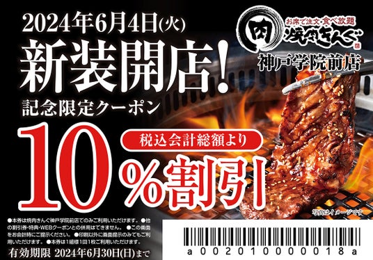 株式会社物語コーポレーション(本社:愛知県豊橋市/代表取締役社長:加藤 央之)は、2024年6月4日(火)に、『焼肉きんぐ 神戸学院前店』(兵庫県神戸市)を新装開店いたします。これを記念して、2024年6月30日(日)までご利用いただける『焼肉きんぐ 神戸学院前店』限定のwebクーポンを配布します。