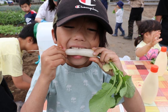 収穫する大根は、4月に開催した「まめまめコース」の初回で枝豆とともに種まきしたものです。枝豆は7月の収穫を予定し、年間を通して畑の中から野菜の生育を見守ります。畑は提供する利根川生産者グループの生産者が栽培管理します。草取り作業も参加者親子らの手で行い、食べ物が育つ過程に必要な時間と手間を体験していきます。農業の楽しさや大変さ、収穫の喜びに触れ生産者と交流します。