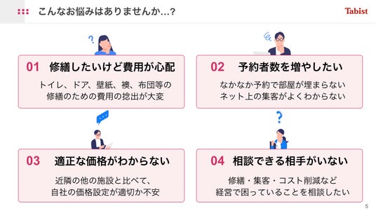 二つ目は、1施設最大150万円の設備投資資金をご提供するという点です。小規模施設にとって大きな負担となっている施設の修繕費用をTabistが負担し、宿泊環境を整え、施設の魅力を最大化したうえで集客サービスを提供します。