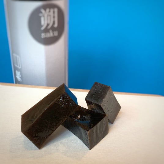 〇「琥珀糖 朔」は新月に汲み上げた海水を使ったミネラル豊かな天然塩を、やはりミネラル豊かな黒糖と合わせた琥珀糖に仕上げました。「朔(ついたち)」と銘しております。
