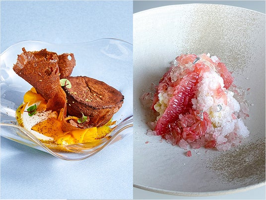 左:ショコラトロピック+右:グレープフルーツロゼとクラフトジンのデザート 4,400円(1人前2皿 お菓子付き) 各日30点限り