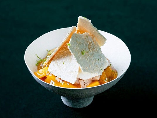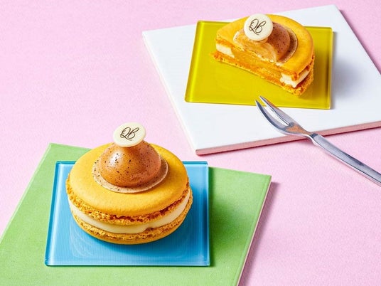 遊び心あふれるシェフの新作は、独創的なマカロン。クラシックなマカロンの生地にレモンとライムを用いたガナッシュを合わせ、マンゴーとパッションフルーツを使用した濃厚ながらも爽やかなエキゾチックコンフィが加えられ、その味わいには深みと鮮やかなフレッシュさをもたらします。