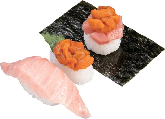 (みなみ鮪大とろ・バフンうに大葉にぎり・みなみ鮪とろぶつ バフンうに包み)