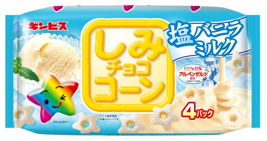 「しみチョココーン塩バニラミルク 4P」はスナック生地にホワイトチョコをしみ込ませ、バニラアイスをイメージした“バニラミルク風味”の商品です。