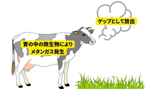 牛などの反すう動物の胃に存在する微生物は、消化分解と同時にメタンを生成し、それらは主にゲップとして大気中に排出されます。メタンは二酸化炭素の28倍の温室効果があり、世界に数十億頭いるとされる反すう家畜によって排出されるメタンは、世界の温室効果ガス総排出量の約5%(CO2換算)を占めるとされています*3 。気候変動を抑制するため、一部の国では畜産業由来の温室効果ガス排出の削減目標が設けられるなど、解決策が求められています。