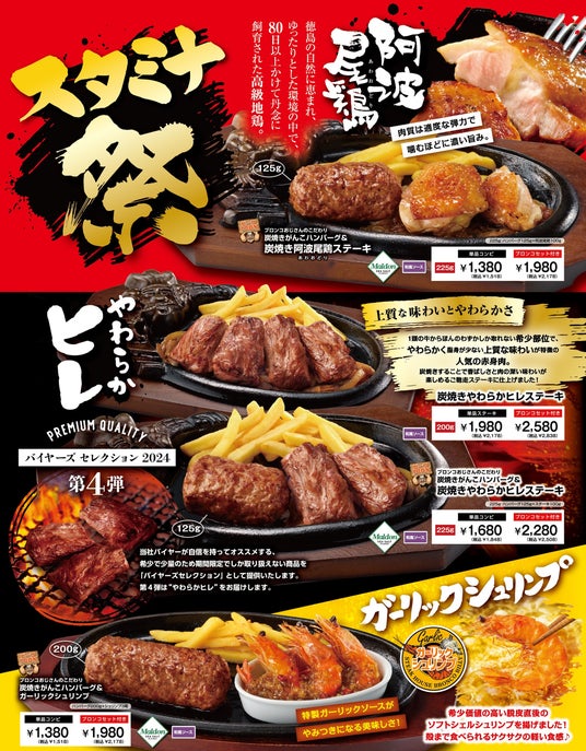 ステーキハウス ブロンコビリーを全135店舗展開する株式会社ブロンコビリー(本社:愛知県名古屋市 代表取締役社長:竹市 克弘)は、5月24日(金)より『スタミナ祭』として、バイヤーが自信を持ってオススメする「炭焼きやわらかヒレステーキ」、高級地鶏の「炭焼き阿波尾鶏ステーキ」、皮まで丸ごと楽しめる「ガーリックシュリンプ」の3商品を期間限定で提供します。