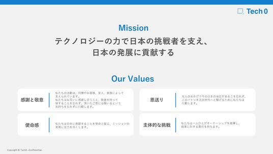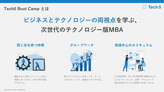 株式会社Tech0は、日本のビジネスリーダーたちにエンジニアのスキルを身に着けてもらい、事業を創り出し、日本に創造と変革を起こしてほしいという想いから生まれました。私たちは「テクノロジーの力で日本の挑戦者を支え、日本の発展に貢献する」というミッションのもと、ビジネスとテクノロジーの両視点から新しい価値を創造する力を育むテクノロジー版MBA(Master of Buissiness and Technology)、Tech0 Boot Campを運営しております。