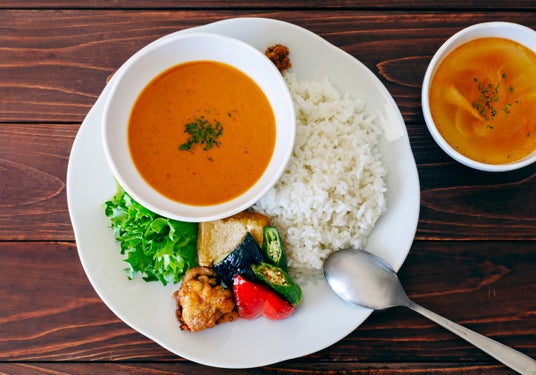 ココナッツベースのマイルドでスパイスの効いたオリジナルカレーに、旬の夏野菜とサクッと揚げたチキン、豆腐、三つ葉をトッピングしました。