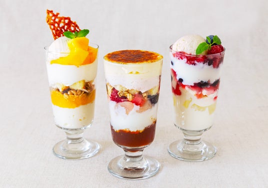 「桃とフロマージュのブリュレパフェ」は、表面のキャラメリゼを割ると、濃厚なカスタードクリームと、たっぷりの桃、さわやかなフロマージュブランが出てきます。濃厚なミルクプリンにマンゴーソースとココナッツアイスを合わせた「マンゴーとココナッツのパフェ」は、夏らしいトロピカルカラーのパフェ。「ベリーと杏仁のパフェ」は、とろける食感の杏仁豆腐とベリーがたっぷり入った甘酸っぱいゼリーの相性が抜群です。