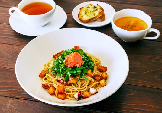 各都道府県のこだわりの食材を使用した、ご当地こだわりメニューを季節ごとに展開しています。今シーズンは、福岡・博多の老舗料亭『稚加榮(ちかえ)』の「辛子明太子」を使ったメニューをお楽しみいただけます。
