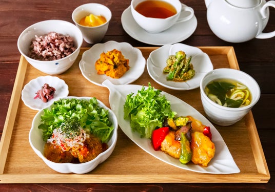 えらべるメインのおかずと、副菜やごはん、みそ汁などがセットになった人気のランチメニューが、夏メニューにリニューアルしました。メインのおかずには、人気の「揚げ鶏のねぎソース」に加え、ハンバーグに野菜をたっぷりとのせ、玉ねぎの甘みが詰まったソースを合わせた「ハンバーグ 和風玉ねぎソース」や、旬の夏野菜と白身魚をカラッと揚げ、コクのあるまろやかな黒酢あんをからめた「白身魚と夏野菜の黒酢あん」が登場します。