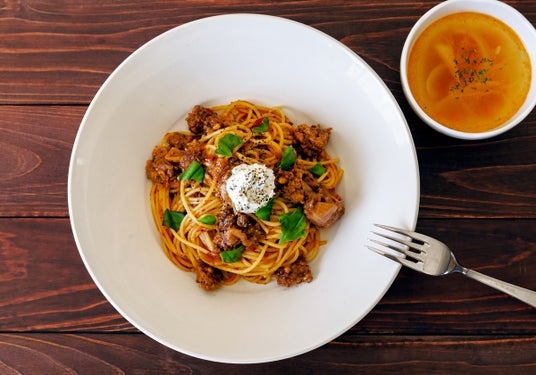 「ラグーソースパスタ バジルクリームのせ」