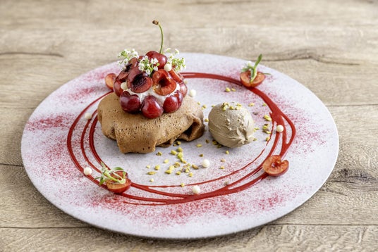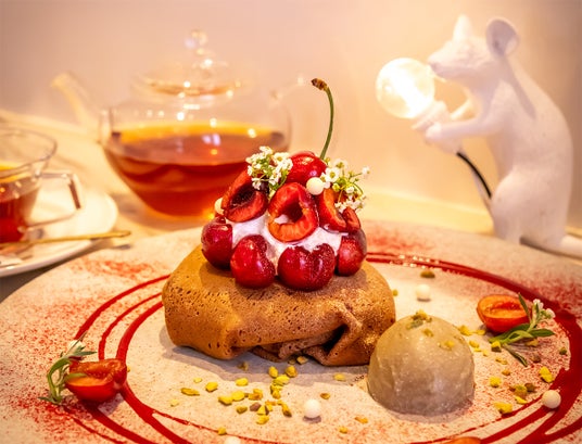 ◆アメリカンチェリーとヘーゼルナッツのクレープ・スリーズ ほうじ茶アイスを添えて