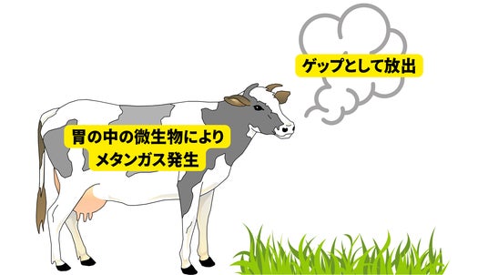 牛などの反すう動物の胃に存在する微生物は、消化分解と同時にメタンを生成し、それらは主にゲップとして大気中に排出されます。メタンは二酸化炭素の28倍の温室効果があり、世界に数十億頭いるとされる反すう家畜によって排出されるメタンは、世界の温室効果ガス総排出量の約5%(CO2換算)を占めるとされています※2 。気候変動を抑制するため、一部の国では畜産業由来の温室効果ガス排出の削減目標が設けられるなど、解決策が求められています。