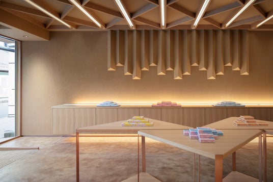 ・日本の伝統的な格天井を「おたべ」の形である三角形にアレンジ。LED照明と組み合わせた現代的なデザイン