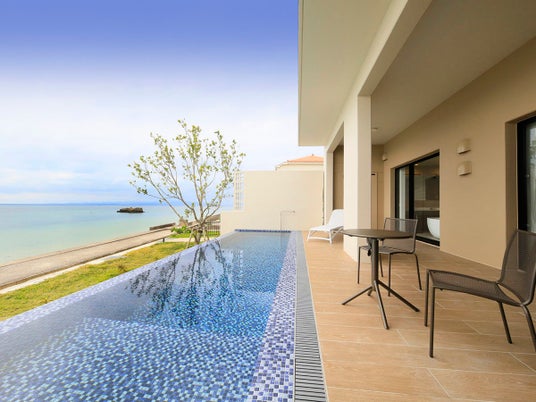 全客室50m2以上のオールスイートルーム。全室キッチン、各種家電、Wi-Fi完備。OceanWingの1階客室にはプライベートプールを完備。