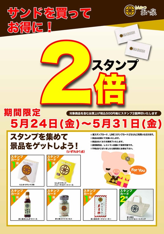 5月24日(金)から31日(金)の期間中、ヒレかつサンドをはじめまい泉のサンドシリーズを直営店舗にてお買い上げのお客様を対象に、ご購入金額の2倍のスタンプを押印します。
