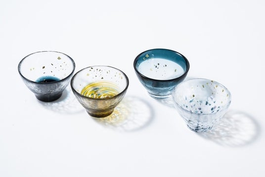 津軽びいどろ 盃 左から、金彩スモーク ボトムブルー、金彩アンバー ブルー、金彩スモーク トップブルー、金彩オパール スモークブルー 各2,200円無味無臭の硝子はお酒の味をダイレクトに味わえて、厚みのある酒器は、繊細で上品な大吟醸に◎。「津軽びいどろ」は青森県の伝統工芸品に指定されています。一つ一つ手作りした風合いのある逸品です。